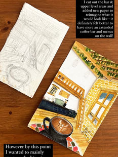 Après avoir décidé de la composition de chaque section, j'ai peint l'intérieur à l'aquarelle et aux encres. Les couleurs riches, les textures et les détails sont destinés à retenir l'attention du spectateur, lui permettant de voyager vers cet espace imaginaire où il peut ralentir et déguster son café de spécialité accompagné d'un latte au homard !