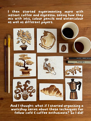 In connection with my passion for coffee and cafes, I organise workshops where participants learn the techniques of painting with coffee. The workshop is meant for both beginners and artists alike and focuses on a different theme everytime for more inspiration!